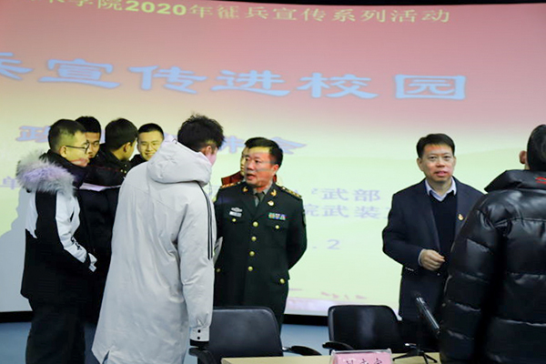 大洼区人民武装部政委刘宏宇针对大学生应征入伍的五大好处及大学生应征入伍优惠政策进行了详细讲解。王俊杰老师对在场的同学进行了积极的动员与鼓励。宣讲后很多同学主动留下来与大洼区人民武装部同志进行面对面的咨询与交流。