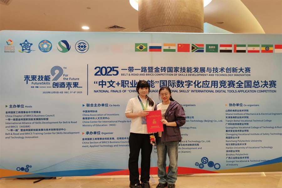 近日,由金砖国家工商理事会中方理事会、一带一路暨金砖国家技能发展国际联盟、一带一路暨金砖国家技能发展与技术创新培训中心主办的“一带一路”暨金砖国家技能发展与技术创新大赛之“中文+职业技能”国际数字化应用大赛,在海南博鳌亚洲论坛国际会议中心拉开了帷幕,我校学生在此项赛事一举摘得一等奖一项、二等奖两项、三等奖一项。本次赛事经过区域赛激烈的角逐推选出优秀选手参加全国总决赛,各区域赛共计选出500余支代表队。其中,我校师范教育学院刘佳彤在一众中职组参赛队中脱颖而出,取得全国总决赛一等奖;经济管理学院李世豪、刘安琪获高职组二等奖,张馨方获高职组三等奖。