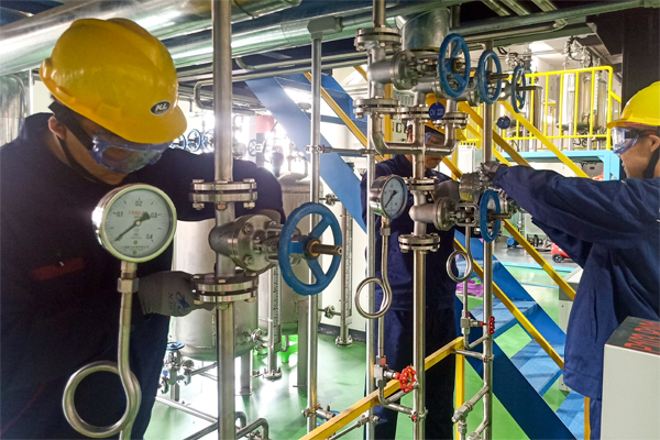 5月7日,学院化学工程系刘洪宇老师和吴春丽老师带领17级中德化工班学生维修燃料油常压蒸馏装置的漏液问题——更换密封垫片。