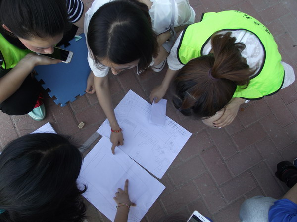 活动于13:30正式拉开帷幕。此次活动共有25名2014级学生参加。内容共分为五项,通过后四项淘汰赛,决出优胜队。第一项、桃园结义。在博学楼内藏有十五张身份卡,让队员们在寻找中找到自己的队伍;第二项、掠影校园。根据所抽到的号码球,依次拍摄相对应的两张图片,照片通过审核即为完成任务;第三项、一心两用。根据抽取任务卡要求寻找符合要求的同学或老师一起完成跳大绳读出绕口令的任务;第四项、我形我塑。根据任务卡上所示地点,绘制该地点的平面图;第五项、大海捞针。5米的距离,按顺序进行翻拍,完成指定任务要求。