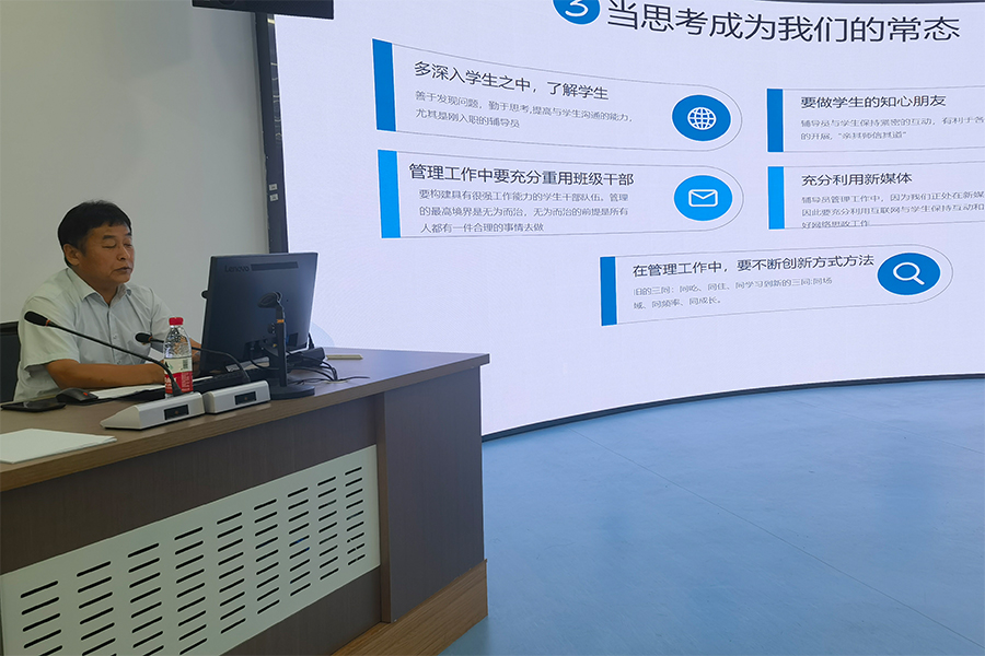 在13日的培训会上,学生工作处副处长王俊杰、建筑工程学院魏冉副教授以及医疗护理学院刘汉迪老师以辅导员专业化、职业化、专家化及辅导员素质能力大赛为切入点,分别作题为“坚持立德树人根本任务做一名‘专业型’辅导员”“以赛促学、以学促行、以行明德”“用专业伴学生远行——关于参加第九届辽宁高校辅导员素质能力大赛的实践与思考”的报告,他们通过对辅导员队伍相关政策的解析、对辅导员素质能力大赛的比赛流程、备赛技巧、大赛重难点的分析和讲解,帮助全体辅导员对素质能力大赛有了更加系统和深刻的认识,通过分享自己的感悟和经历,帮助辅导员明确“不断丰富理论知识,提升看问题的高度,结合实际工作多加历练”的工作目标。