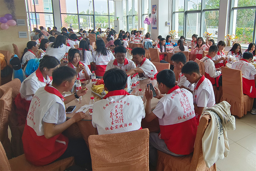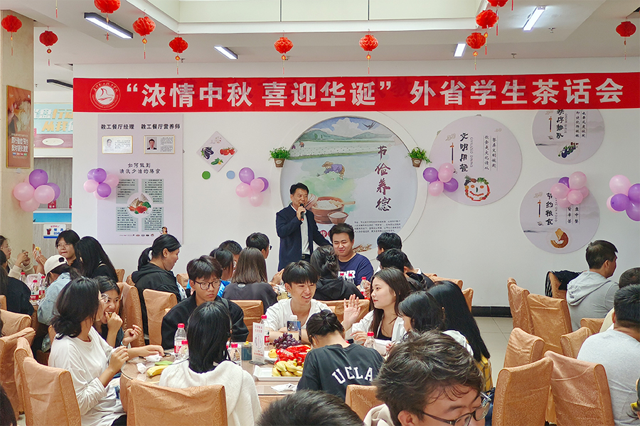返校后,在学生工作处的精心筹备下,参加活动的全体师生于我校教工食堂举办了“浓情中秋 喜迎华诞”外省学生茶话会。餐桌上满盘的瓜果和精美的月饼,烘托出祥和的节日气氛,让每名省外留校学生在校园里体会到家的温馨与幸福。师生们一边分享节日美食,一边用歌声和话语表达自己的幸福心情,分享本次社会实践活动的收获与感受。