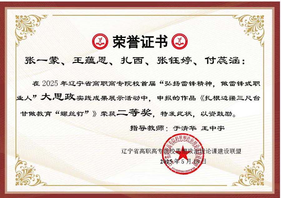 为深入贯彻习近平总书记在辽宁考察时的重要讲话和重要指示精神,大力弘扬辽宁“红色六地”文化,贯彻落实省委教育工委、省教育厅作出的《关于组织开展“弘扬雷锋精神,奋斗成就梦想”2025年春季学期“开学第一课”活动的通知》要求,在第62个学雷锋纪念日到来之际,辽宁省高职高专院校思想政治理论课建设联盟面向全省高职高专院校(包括本科院校高职专科)大学生开展了“弘扬雷锋精神 做雷锋式职业人”实践教学成果主题作品征集及展示汇报活动。活动历时两个多月,结果现已揭晓,我校选送作品喜获二、三等奖各两项。