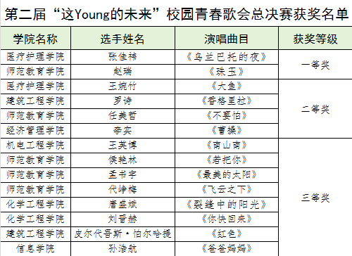 经过激烈的角逐,评委老师们从演唱技巧、情感表达、舞台表现等多个方面进行综合评分,最终评选出本届青春歌会的一、二、三等奖。获奖名单如下: